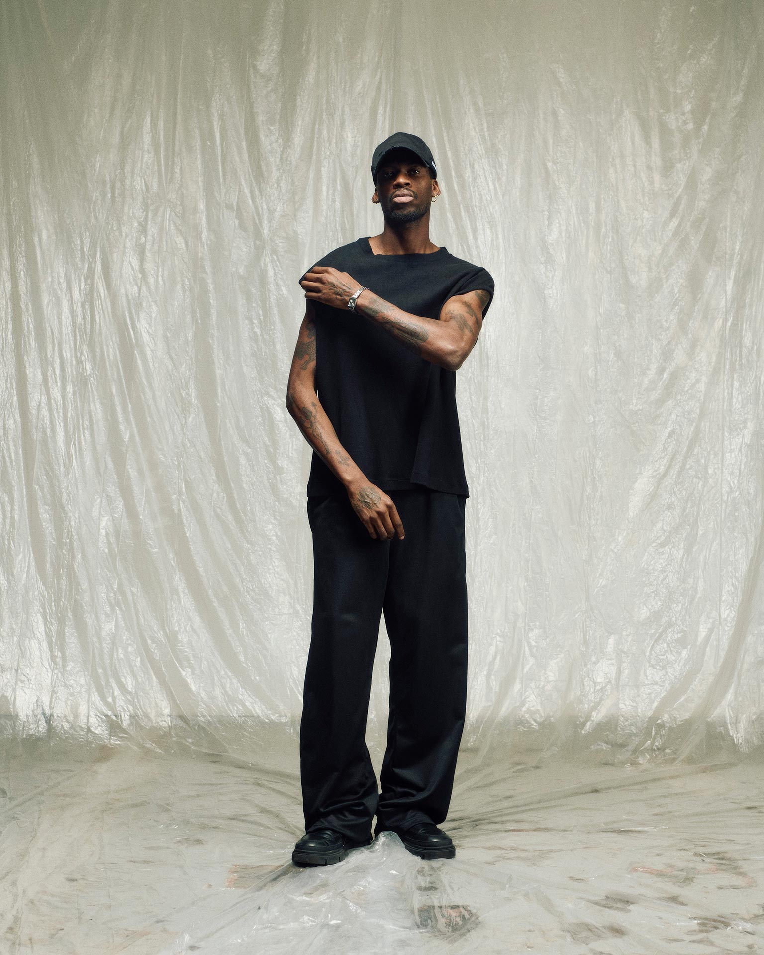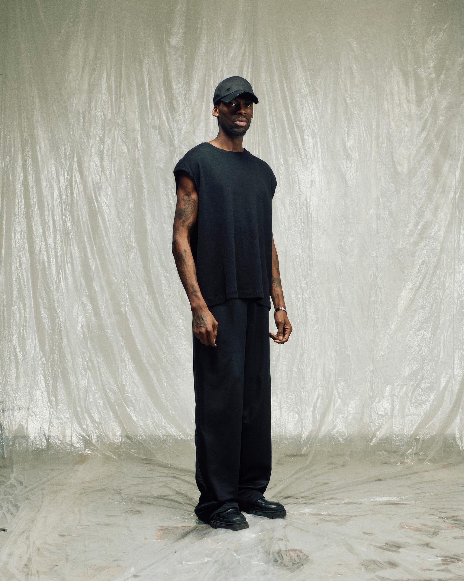 Ribbed tank with broad shoulders and structured fall.