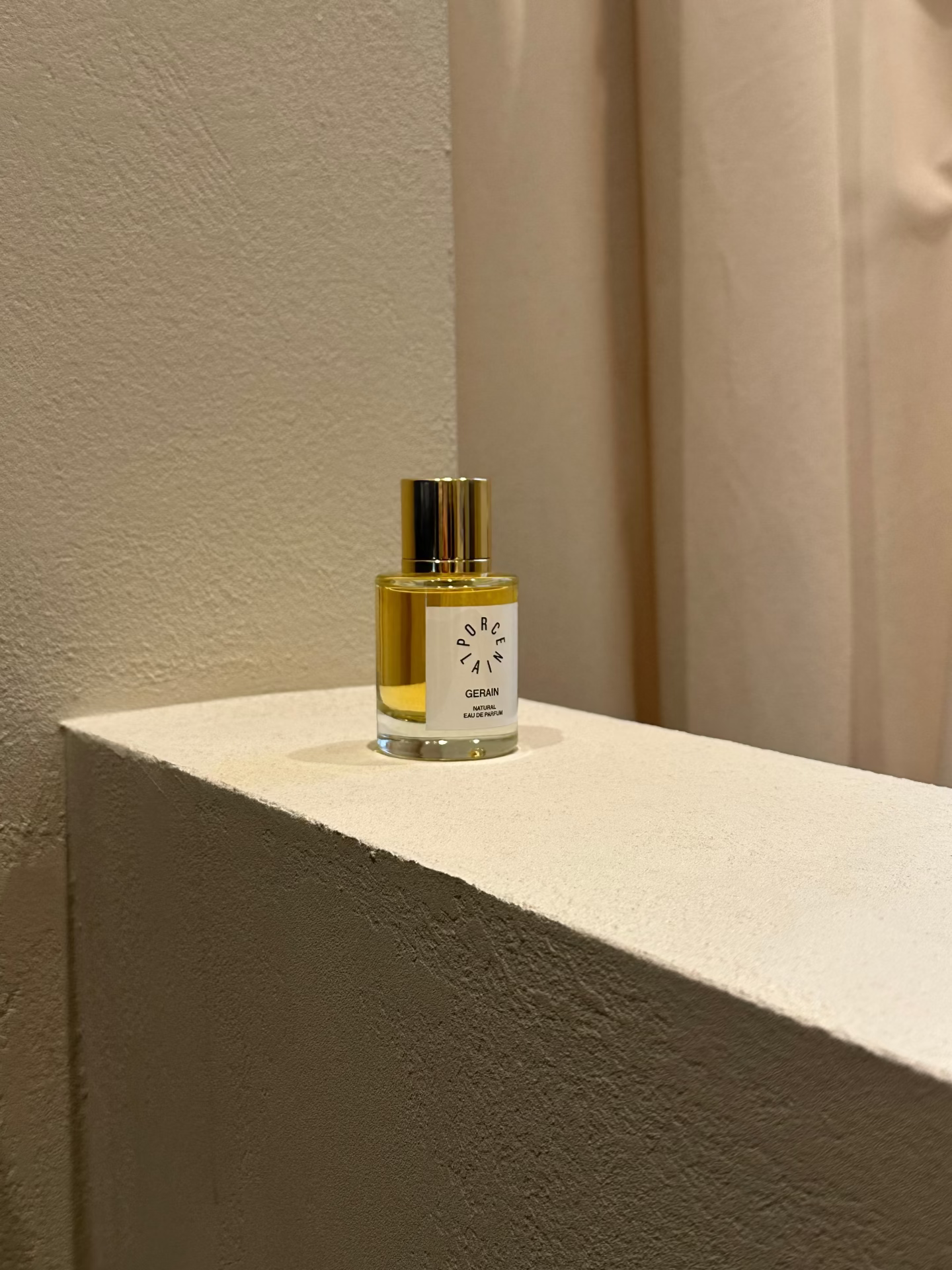 Small bottle of perfume labeled 'GERAIN' on a smooth surface with a neutral background